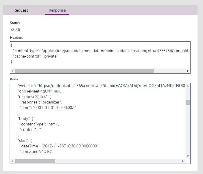 The start dateTime was being returned but I noticed that it was in a different format and that is where I have hit the brick wall. I have tried changing the Swagger file to treat this as text but the schema validation fails saying that it found a datetime format instead. Marc La Fleur has kindly offered to take a look so this blog is largely for him to take a look but anyone else who has some ideas would be very welcome! Below is the Swagger file I used with the Group ID removed.